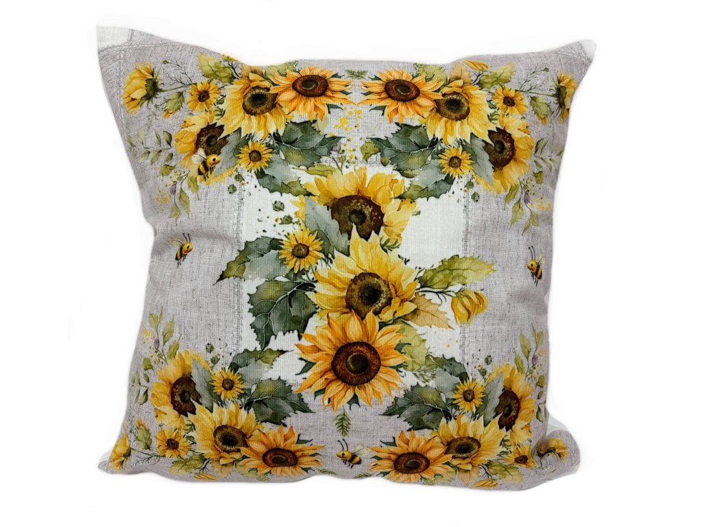Motiv je rozmístěný po celé ploše povlaku, přičemž větší slunečnice dominují středu i okrajům a menší květy a listy vyplňují mezery mezi nimi. Mezi květy jsou navíc zobrazené malé včelky, které dodávají vzoru živost a hravý detail. Barevná kombinace žluté, zelené a přírodních neutrálních tónů působí velmi teple, slunečně a optimisticky.
