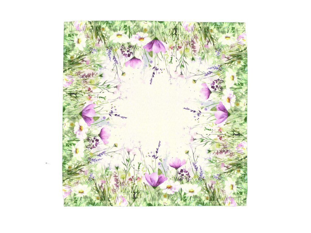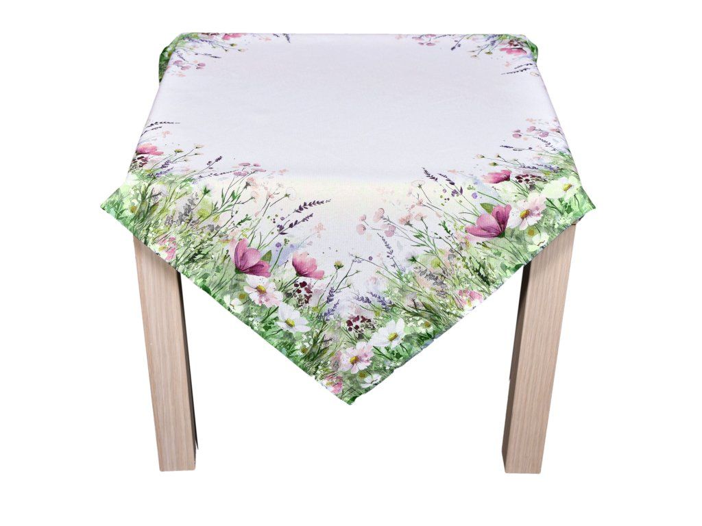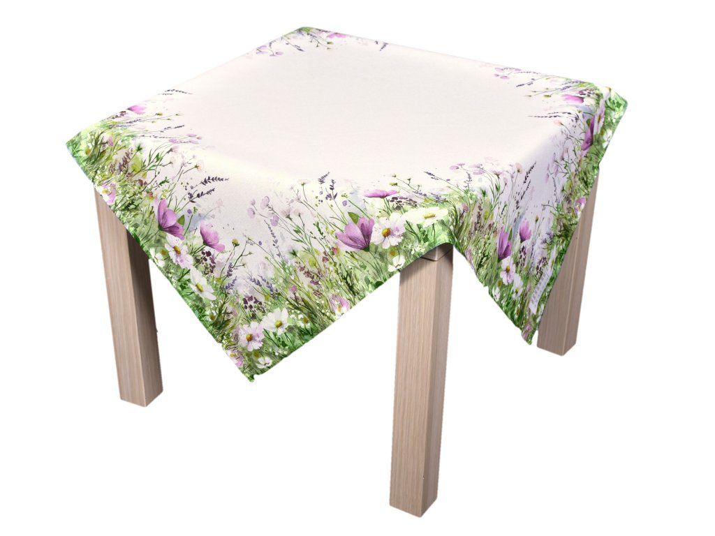Tento polyesterový ubrus zaujme něžným a romantickým designem inspirovaným rozkvetlou loukou. Okraje zdobí bohatý květinový vzor tvořený kombinací bílých kopretin, fialových a růžových květů a jemných zelených stonků a travin, které působí lehce akvarelovým dojmem.