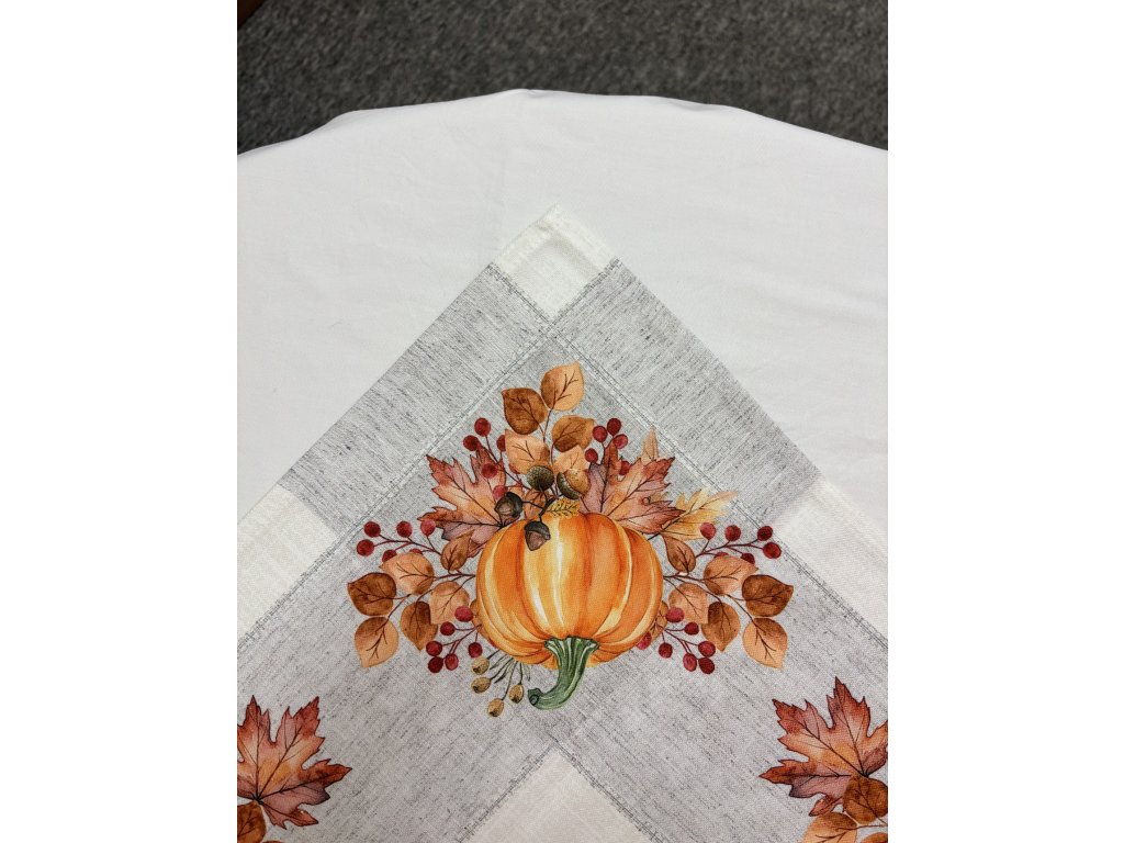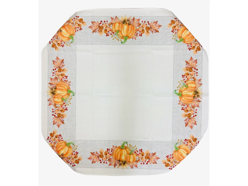 Po celém obvodu ubrusu se táhne široký ozdobný lem s bohatým podzimním motivem. Hlavním prvkem jsou oranžové dýně s jemným stínováním a zelenými stopkami, doplněné o podzimní listí v odstínech oranžové, hnědé a okrové, drobné červené bobule a malé žaludy.