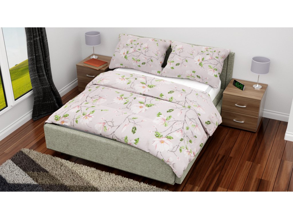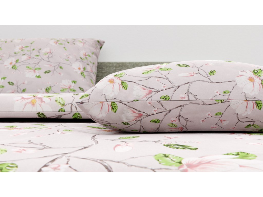 Stylové bavlněné povlečení s motivem květů magnólií s lístky. Ložní souprava je oboustranná, lze tedy používat obě strany povlečení bez jakéhokoliv omezení.