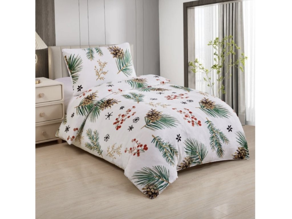 Toto ložní povlečení zaujme na první pohled svým jemným, ale zároveň výrazným přírodním motivem, který evokuje zimní a vánoční atmosféru. Základ tvoří čistě bílý podklad, na němž jsou rozesety ilustrace zelených jehličnatých větviček, šišek, drobných větévek a červených bobulí, doplněné o malé dekorativní vločky či květinové symboly.
