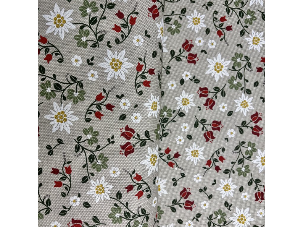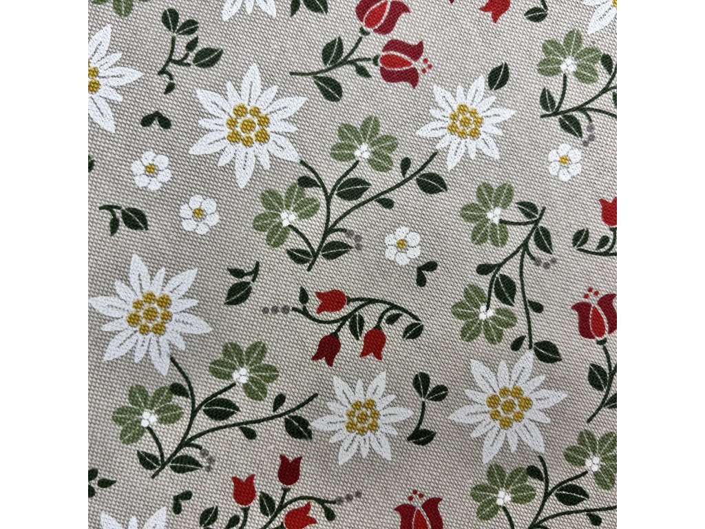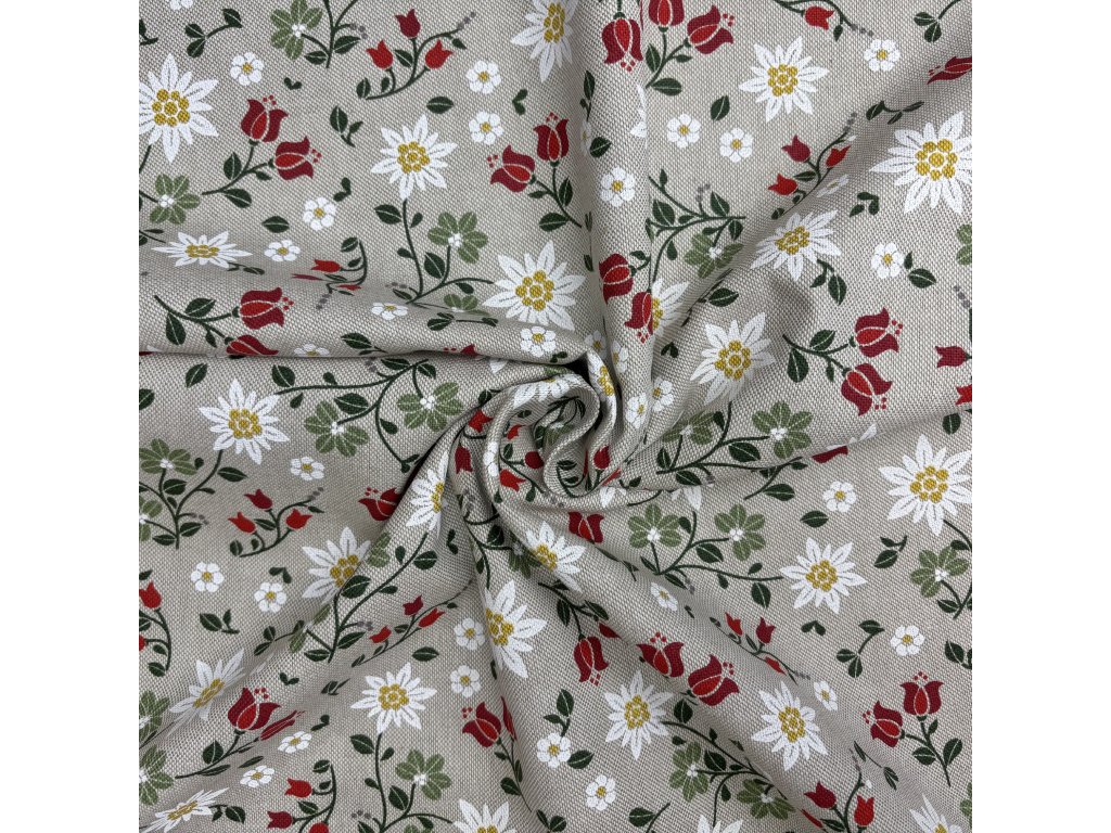 Tato režná dekorační látka je inspirována tradičním alpským a venkovským stylem a nese typický folklorní květinový motiv. Na béžovém podkladu s přirozenou strukturou plátna se pravidelně opakuje vzor s bílými protěžemi, drobnými červenými květy, zelenými čtyřlístky a jemnými bílými kvítky. Kombinace přírodních barev – zelené, bílé, červené a žluté – působí harmonicky a navozuje domáckou a útulnou atmosféru.