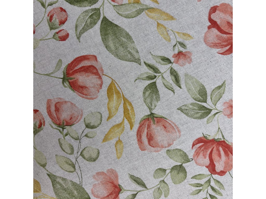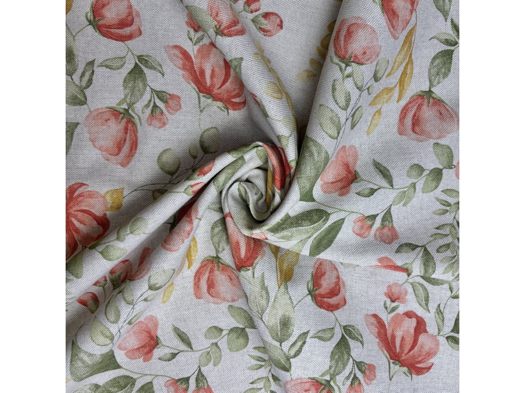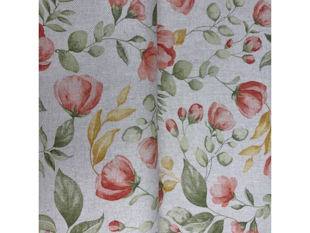 Tato režná dekorační látka působí jemně a romanticky díky decentnímu květinovému vzoru v přírodních tónech. Na světle béžovém podkladu s viditelnou strukturou plátna se rozprostírají růžové květy s akvarelovým efektem, doplněné světle zelenými lístky a drobnými akcenty v hořčicově žluté barvě. Květiny i listy mají ručně malovaný charakter, který působí vzdušně, elegantně a harmonicky.