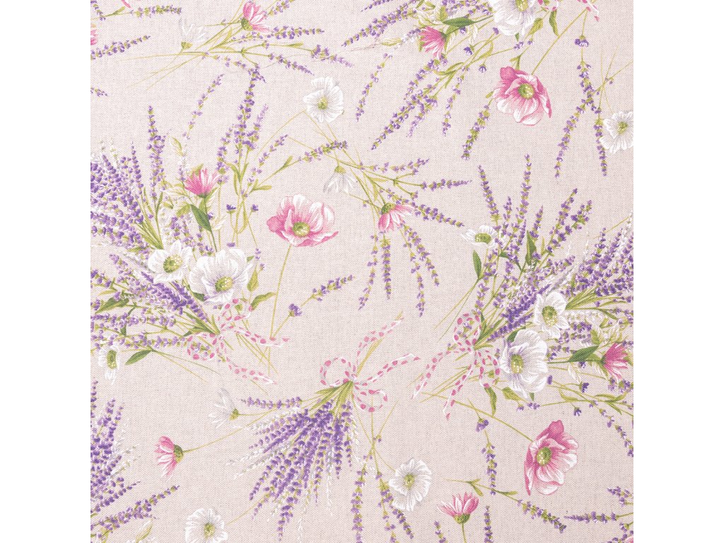 Režná látka s motivem kytice lučního kvítí na béžovém podkladu.