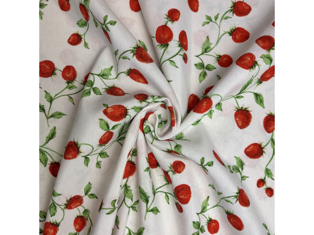 Tato bavlněná látka působí svěže a hravě díky vzoru červených jahod doplněných o zelené lístky na bílém podkladu. Realisticky ztvárněné plody vytvářejí letní a veselou atmosféru, která vnese do interiéru svěžest a energii.