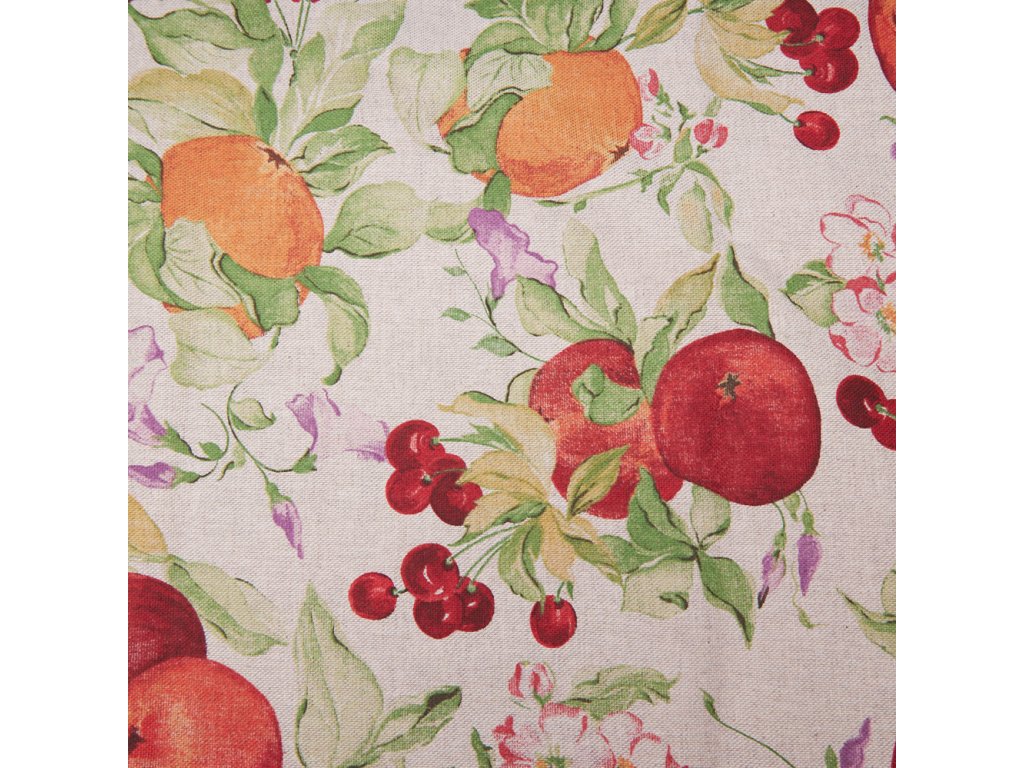 Na béžovém podkladu se rozprostírá pestrobarevné divadlo – od sytě červených jablek po delikátní fialové kvítky. Každý kousek látky je svědkem mistrovského řemeslného umu, který přetváří každodenní materiály v dílo, jež oživí každý interiér. Vytvořte si pohodlí domova s touto látkou, ať už jako záclony, ubrusy, nebo dekorativní polštáře.