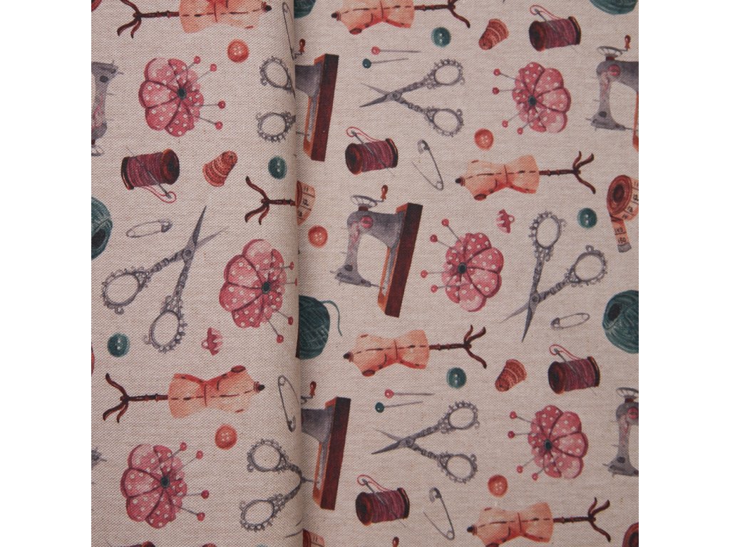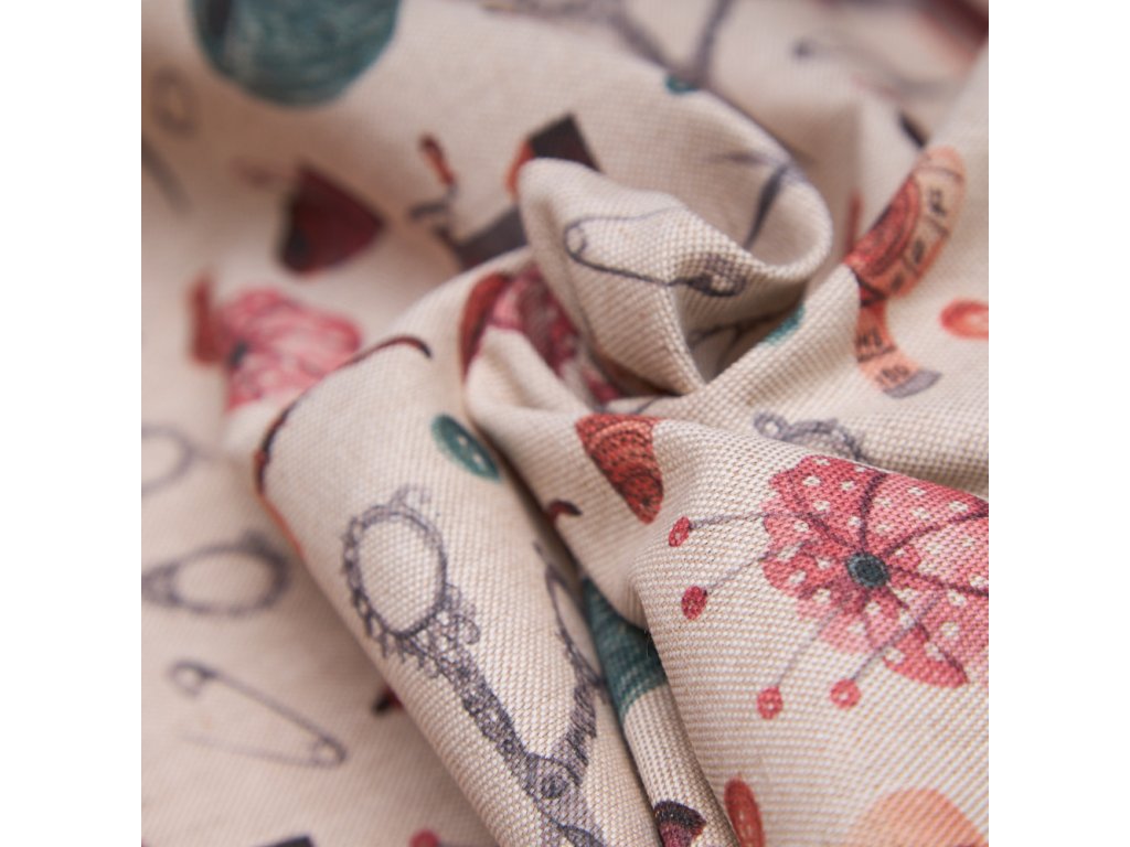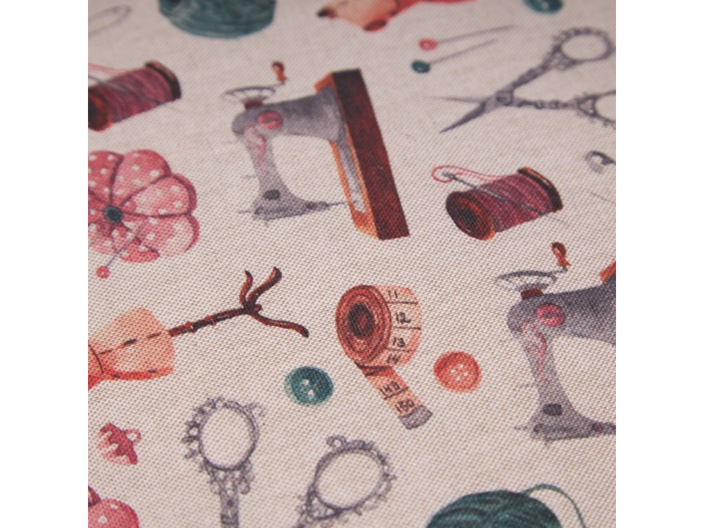 Design látky je inspirován šicím ateliérem, obsahuje motivy šicích strojů, nití, jehel, metrů a dalšího šicího příslušenství, vše na jemném béžovém podkladu, který dodává látce nadčasový vzhled. Detaily jsou navrženy s ohledem na historii šití, což přináší unikátní estetický zážitek.