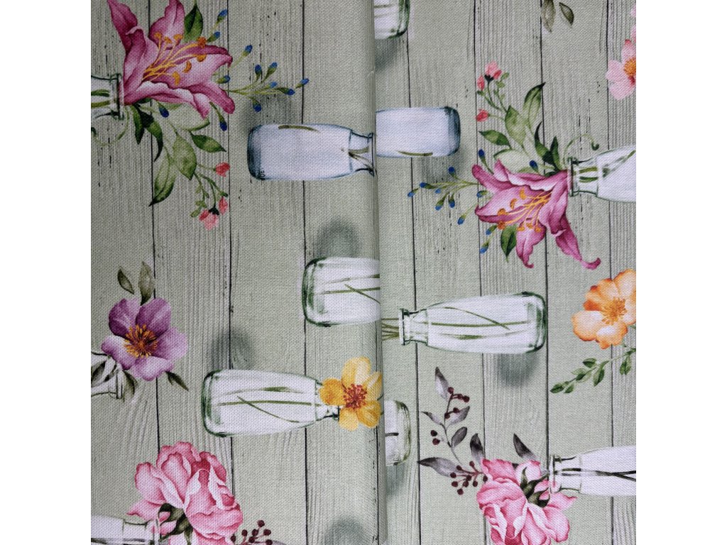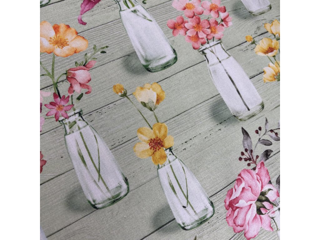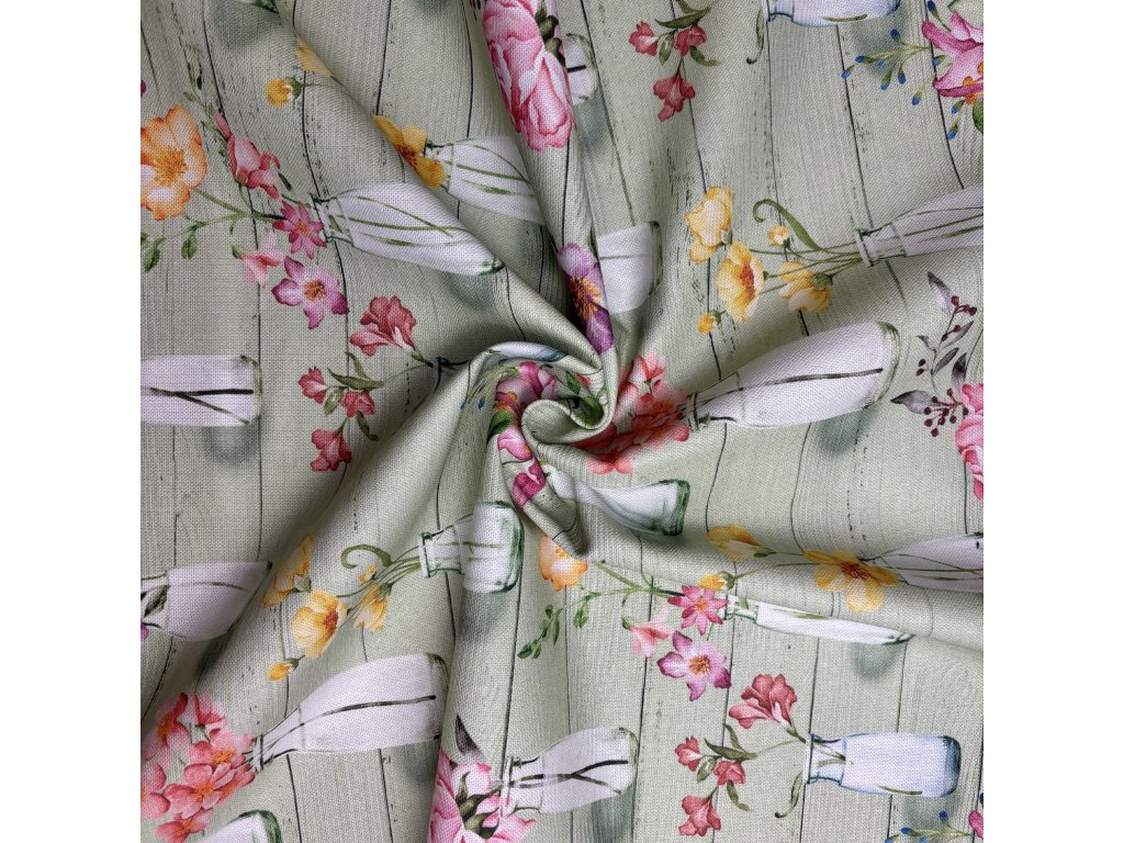 Tato režná dekorační látka přináší svěží a romantický vzhled díky detailnímu potisku květin naaranžovaných ve skleněných lahvích, které připomínají malé vázičky. Motiv je rozvržen na podkladu imitujícím jemně patinované dřevěné prkno v pastelově zeleném odstínu, což vytváří dojem rustikálního venkovského interiéru.