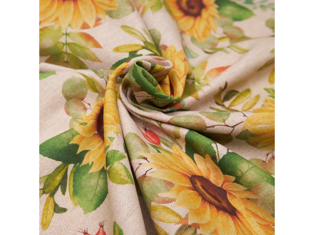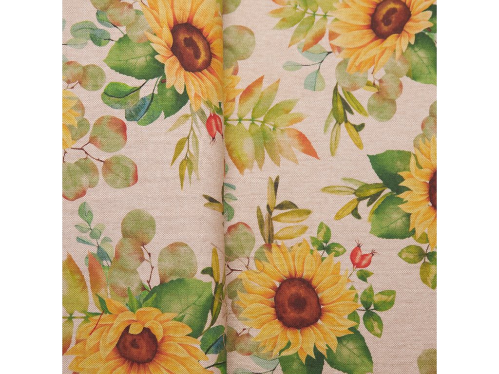 Objevte krásu této režné látky s úchvatným motivem slunečnic a jemně barevných listů. Složení 80% bavlna a 20% polyester zaručuje, že je látka nejen měkká a příjemná na dotek, ale také odolná a snadno udržovatelná. Díky svému výraznému a přírodním vzoru je tato látka ideální volbou pro různé projekty od šití dekorativních polštářků, ubrusů, závěsů až po obaly na sešity či stylové tašky.