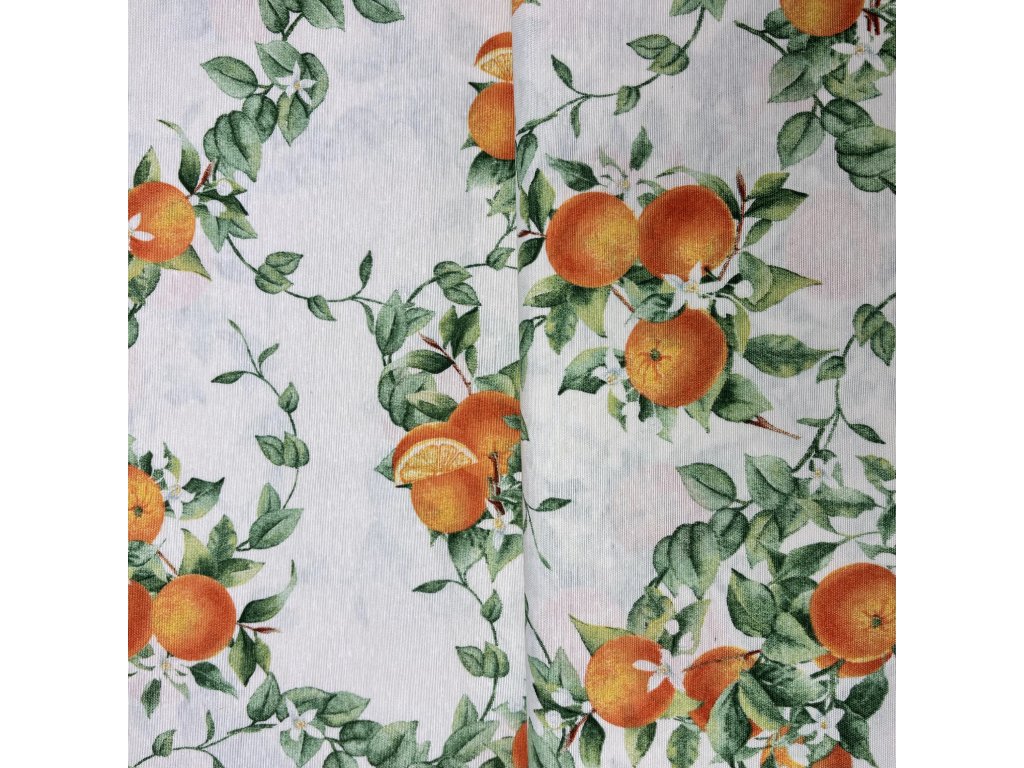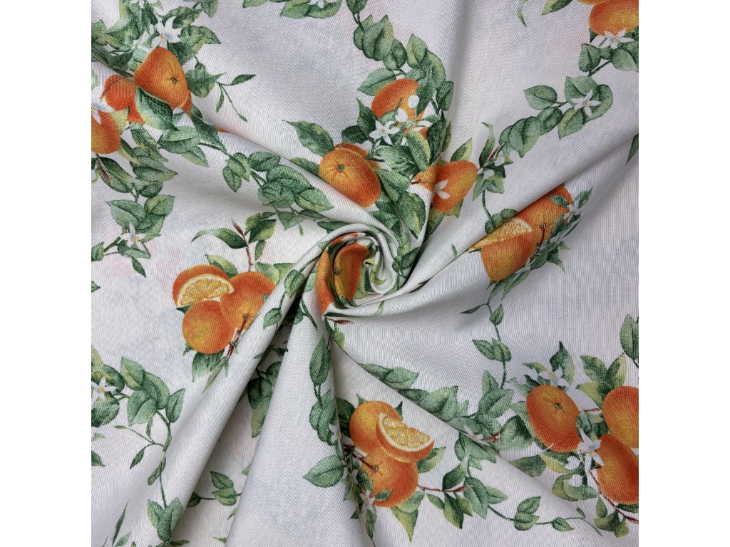 Tato svěží bavlněná látka je zdobena motivem šťavnatých pomerančů se zelenými lístky a jemnými květy na bílém podkladu.