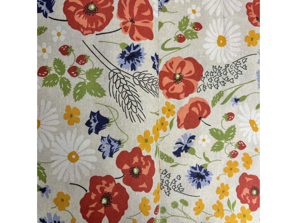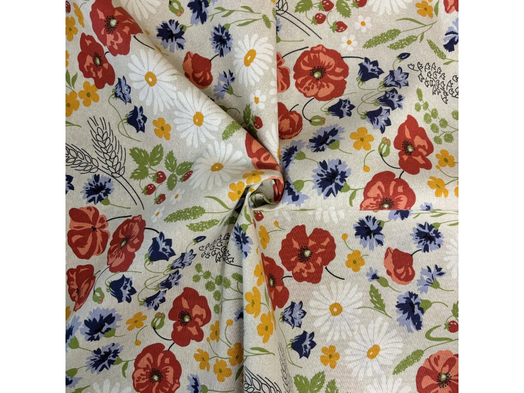 Barevná paleta v odstínech červené, žluté, modré, bílé a zelené vytváří harmonický letní dojem a přináší do interiéru nádech přírody a venkova. Látka je pevná, prodyšná a vhodná pro výrobu ubrusů, závěsů, tašek, povlaků na polštáře či kuchyňského textilu.