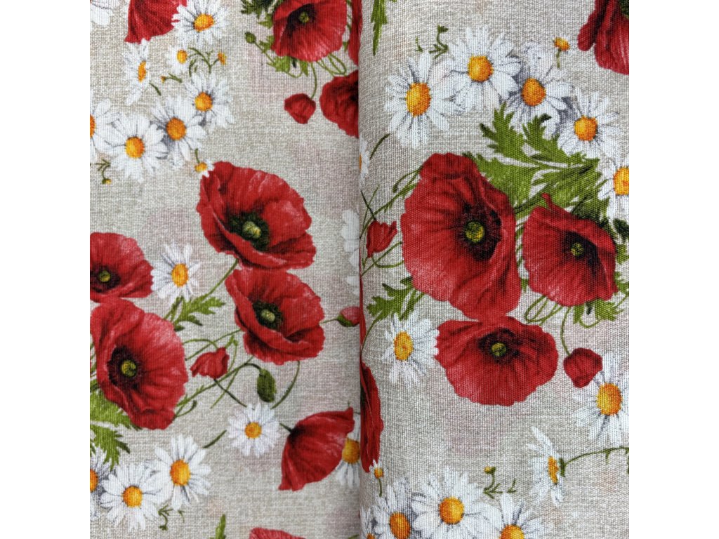 Dekorativní bavlněná látka na světlém režném podkladu zaujme bohatým květinovým motivem, ve kterém dominují sytě červené vlčí máky s tmavými středy, doplněné něžnými bílými kopretinami se žlutým středem.