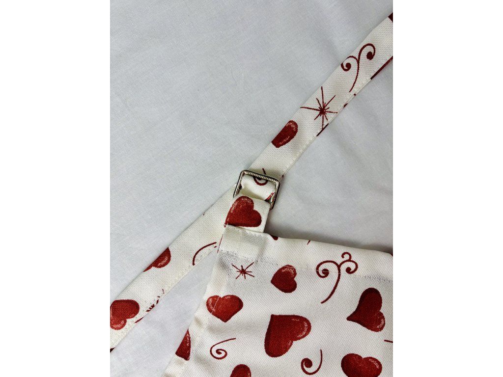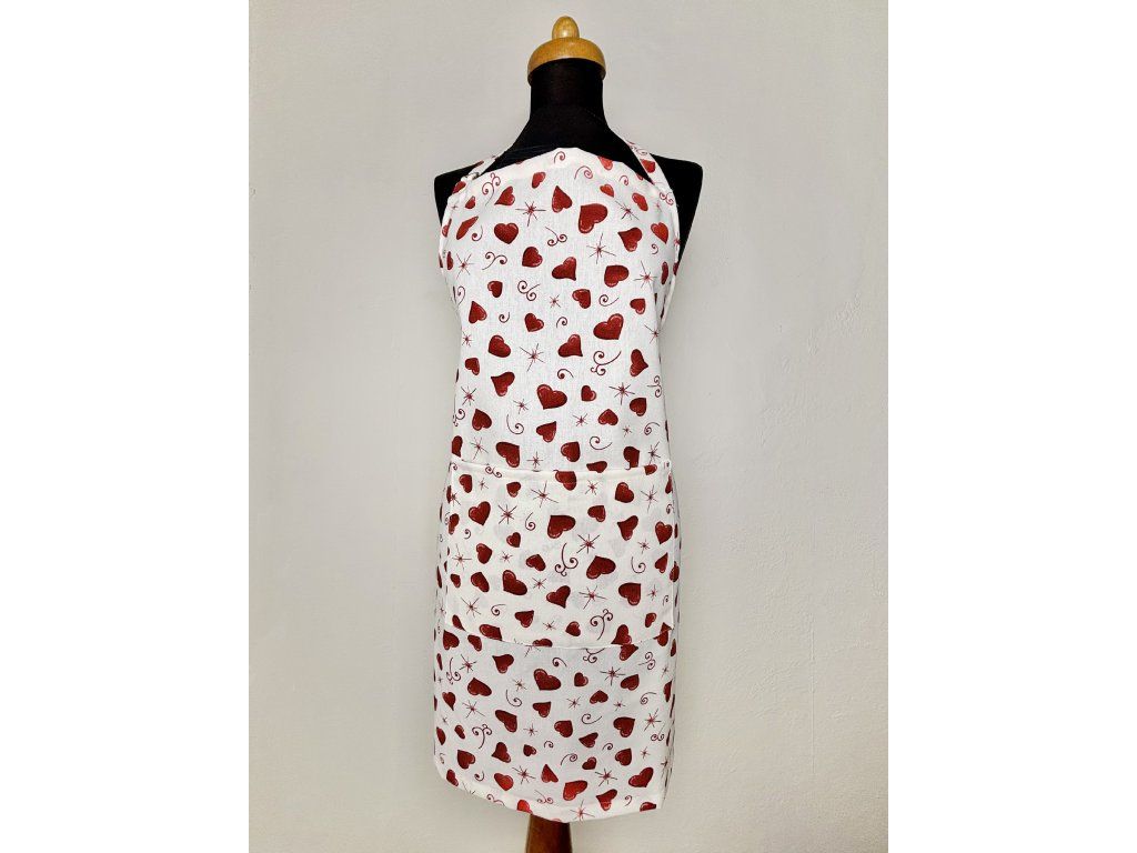 Bílá kuchyňská zástěra je vyrobena z hladké, pevnější látky a po celé ploše ji zdobí hravý vzor červených srdíček v různých velikostech, doplněný drobnými hvězdičkami a jemnými dekorativními kudrlinkami, které celku dodávají romantický a lehce retro vzhled.