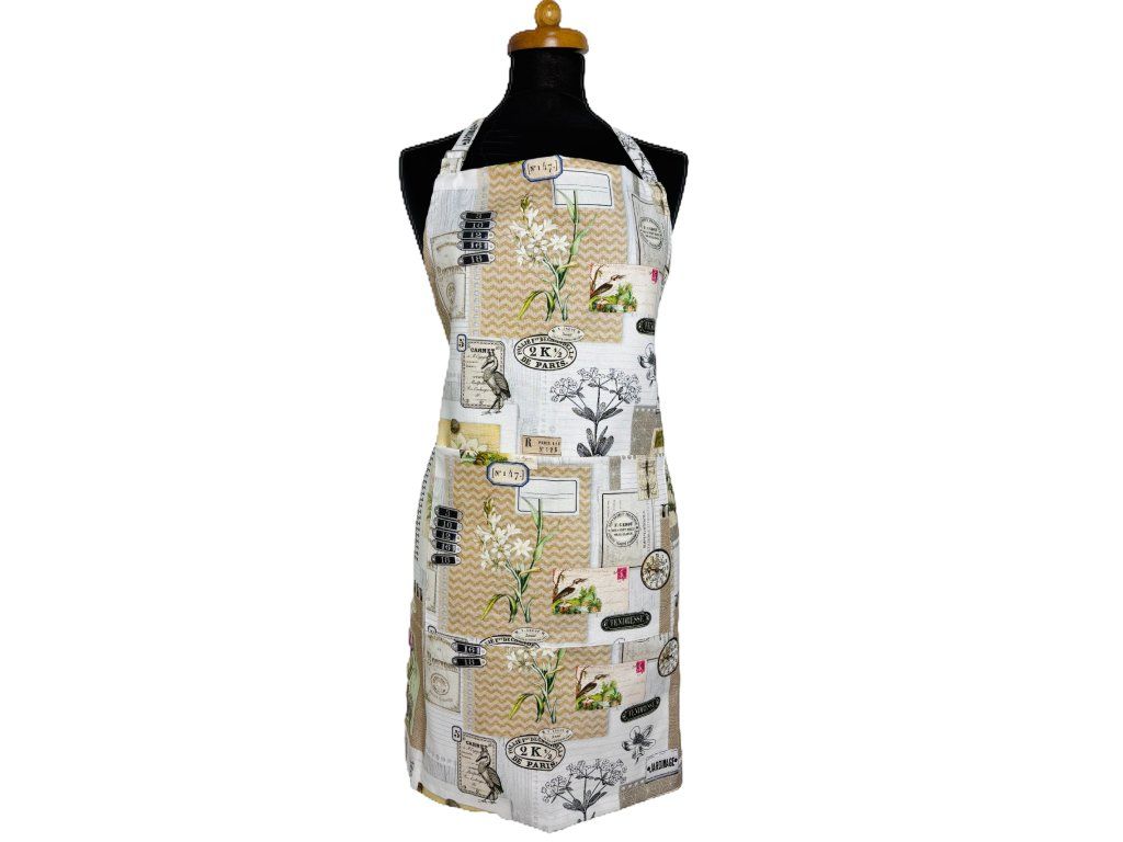 Tato elegantní kuchyňská zástěra v jemných přírodních tónech zaujme originálním vintage motivem inspirovaným starými botanickými atlasy a poštovními pohlednicemi.