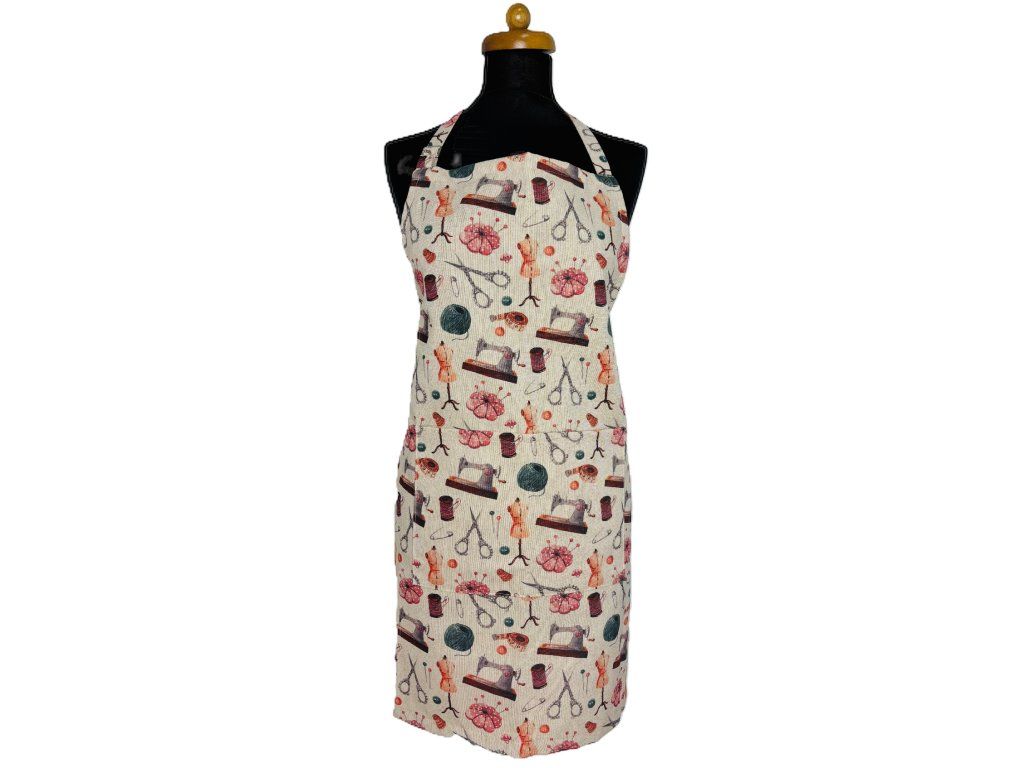Tato stylová kuchyňská zástěra v jemném přírodním odstínu zaujme originálním motivem inspirovaným světem šití a krejčoviny.