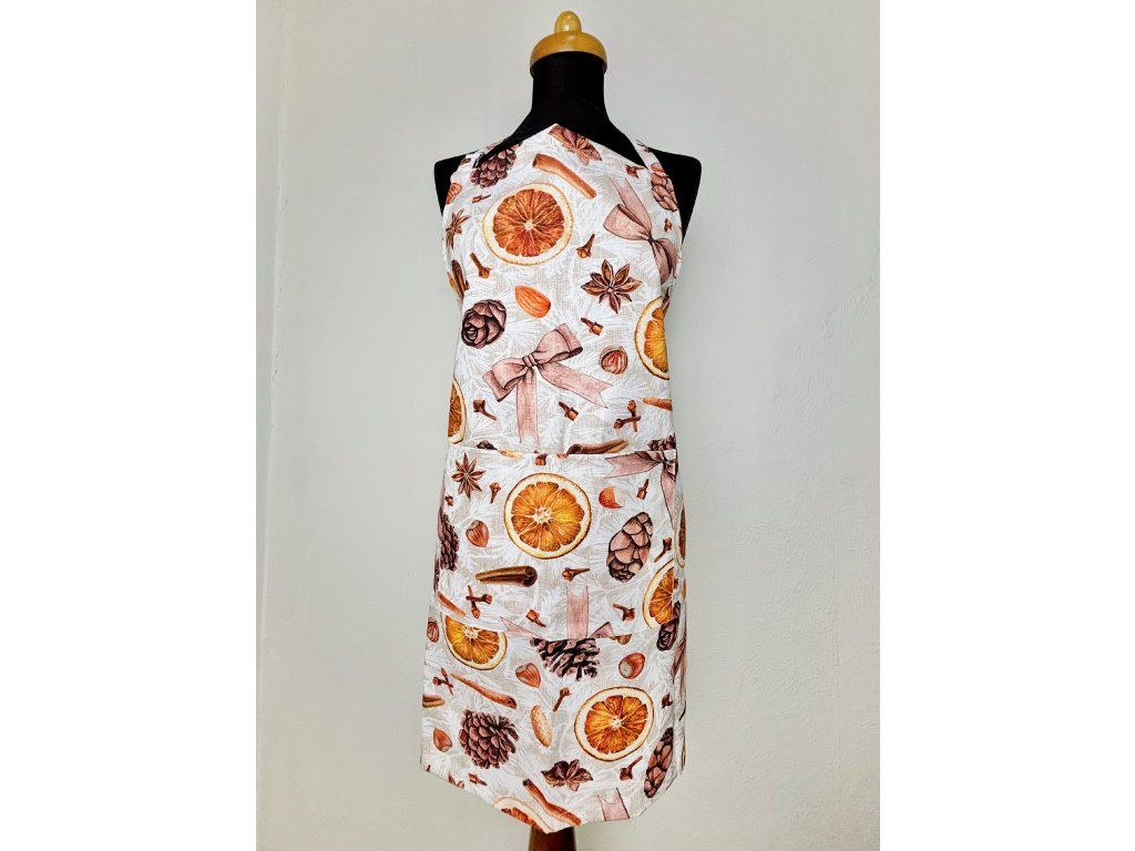 Kuchyňská zástěra je ušitá ze světlé látky s jemnou strukturou a zdobená bohatým podzimně-zimním vzorem, ve kterém se prolínají motivy sušených plátků pomerančů, skořice, badyánu, hřebíčku, šišek a oříšků, doplněné dekorativními mašlemi v tlumených růžovo-hnědých tónech.