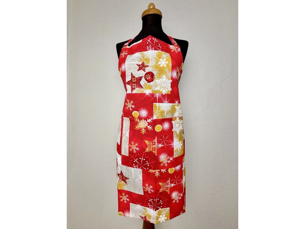Stylová vánoční zástěra v sytě červené barvě je zdobená bohatým svátečním vzorem kombinujícím bílé a zlaté prvky. Dominují jí motivy hvězd, sněhových vloček a jemných geometrických ornamentů, které vytvářejí hravý, ale zároveň elegantní vzhled.