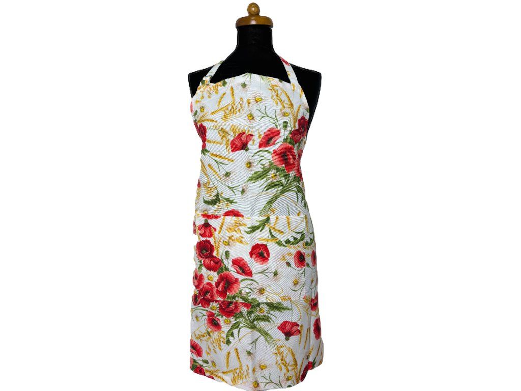 Na světlém podkladu vynikají výrazné červené máky doplněné jemnými bílými kopretinami a zlatavými klasy obilí, které celému designu dodávají hřejivý letní a přírodní vzhled. Praktický střih s náprsenkou chrání oděv při vaření, pečení i grilování, zatímco přední dělená kapsa nabízí dostatek prostoru pro drobné kuchyňské potřeby, utěrku nebo recept.