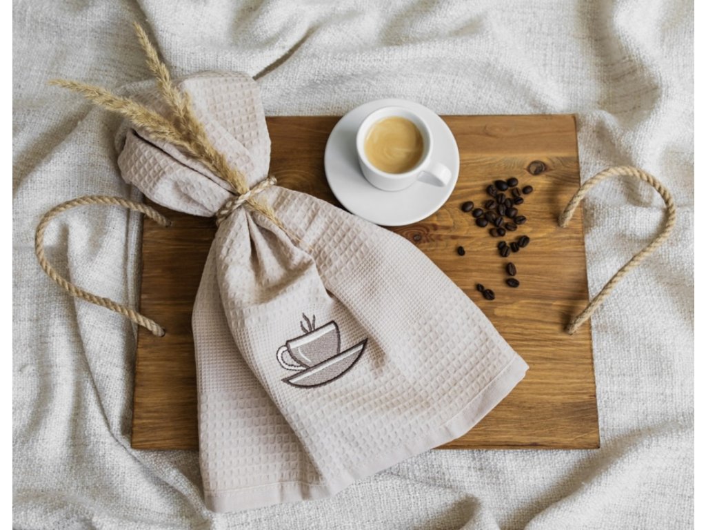 Každá utěrka je zdobená detailní výšivkou s motivem kávy, což z ní činí nejen praktický doplněk, ale i dekorativní prvek nebo milý dárek pro každého milovníka kávy.