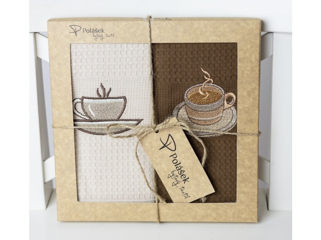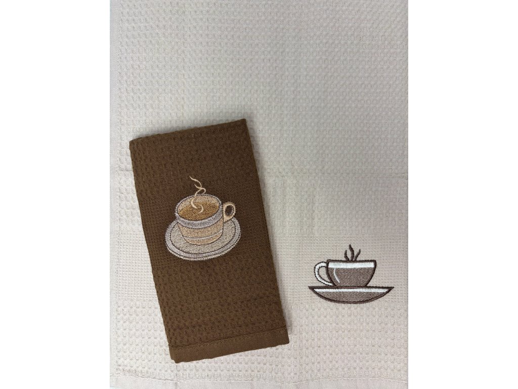 Elegantní sada dvou kuchyňských utěrek s výšivkou šálku kávy je dokonalou kombinací praktičnosti a stylu.