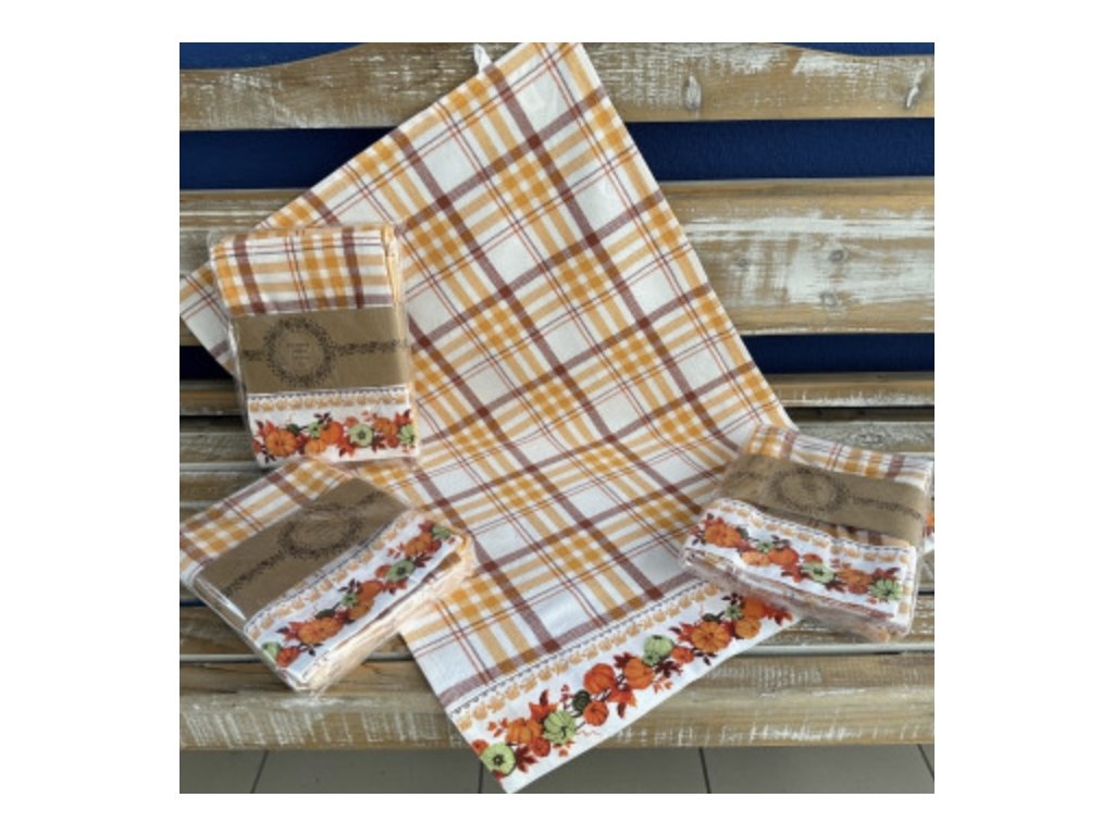 Hlavní plocha je zdobena výrazným kostkovaným vzorem v teplých odstínech oranžové, žluté, hnědé a bílé, což dodává utěrce příjemný rustikální vzhled. Spodní okraj doplňuje dekorativní pruh s detailně zpracovaným podzimním motivem dýní, listů a květin v oranžovo-zelených tónech, který dodává textilii sezónní a útulný charakter.