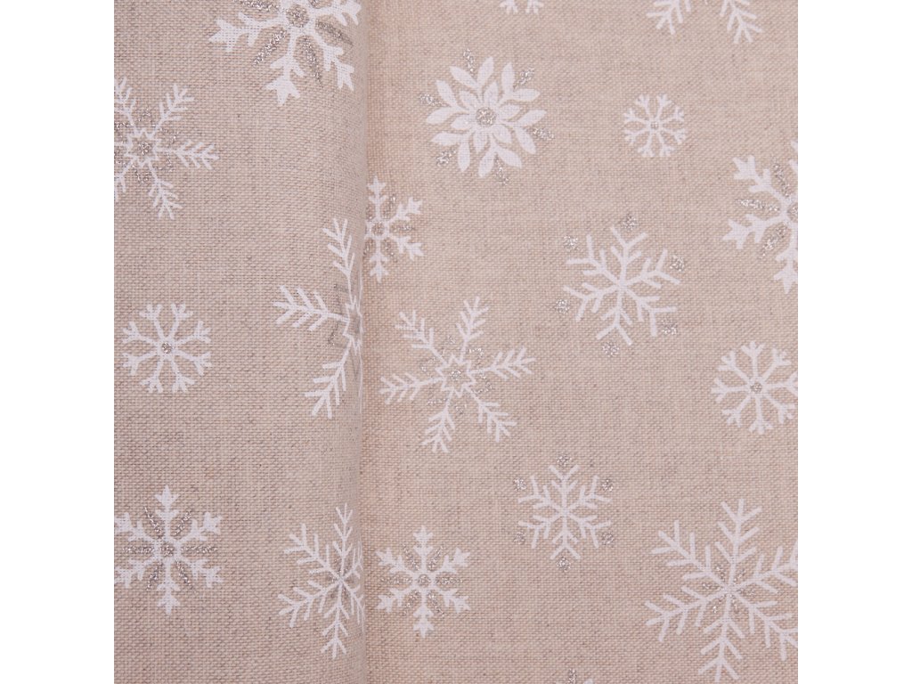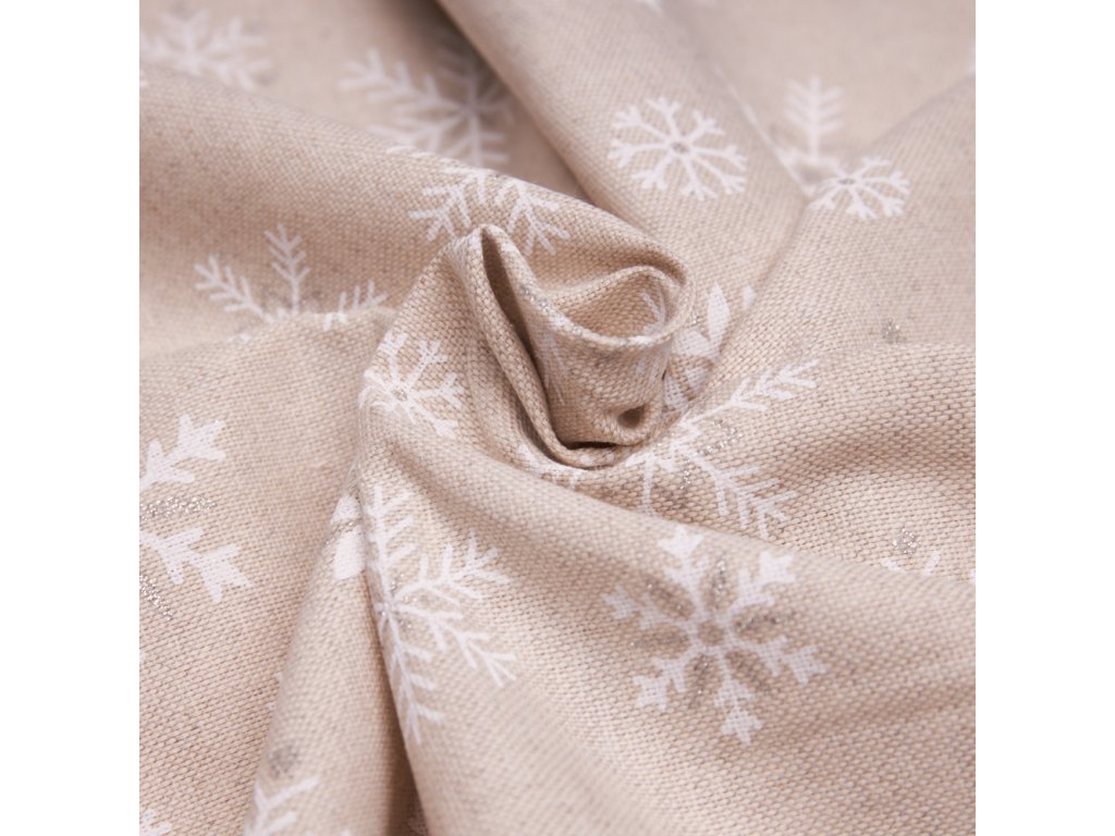 Látka s vánočním motivem vloček na béžovém podkladu. Látka je v metráži o šíři 140 cm a jeze směsi 80% bavlny a 20% polyesteru.