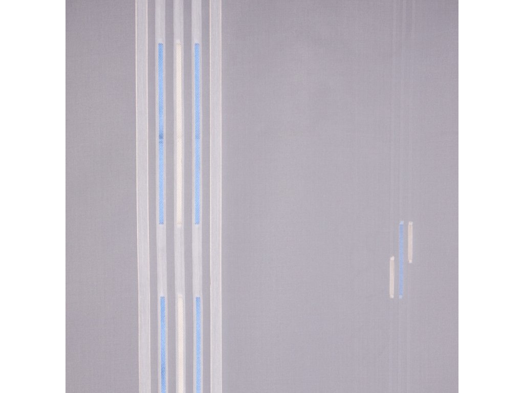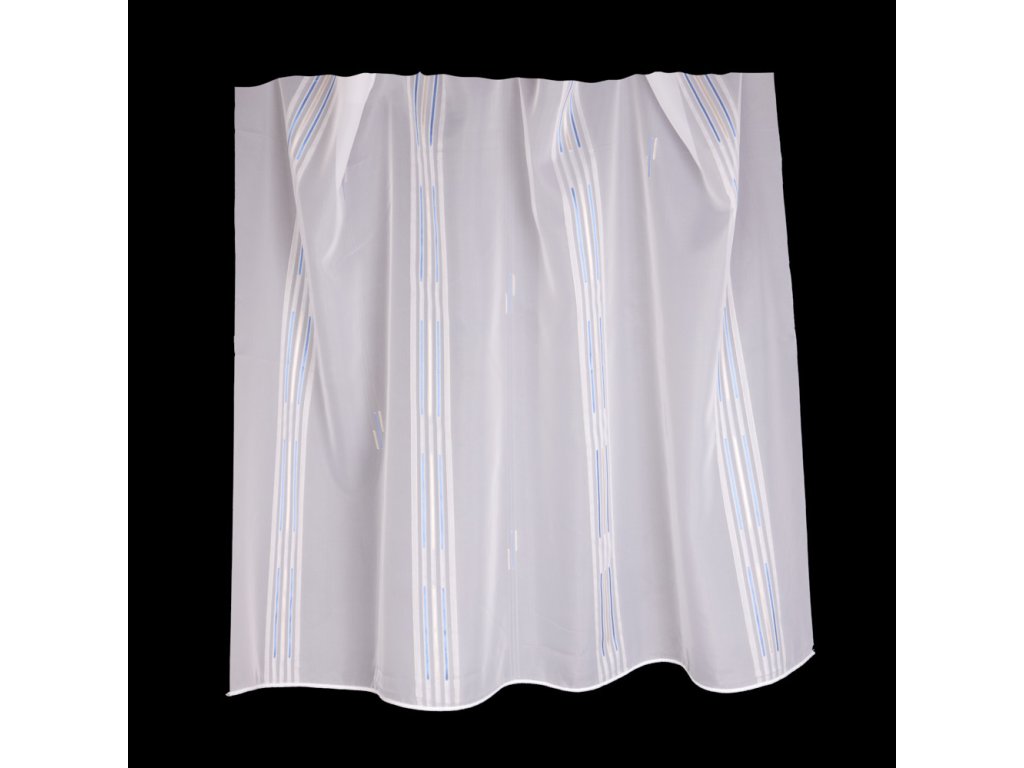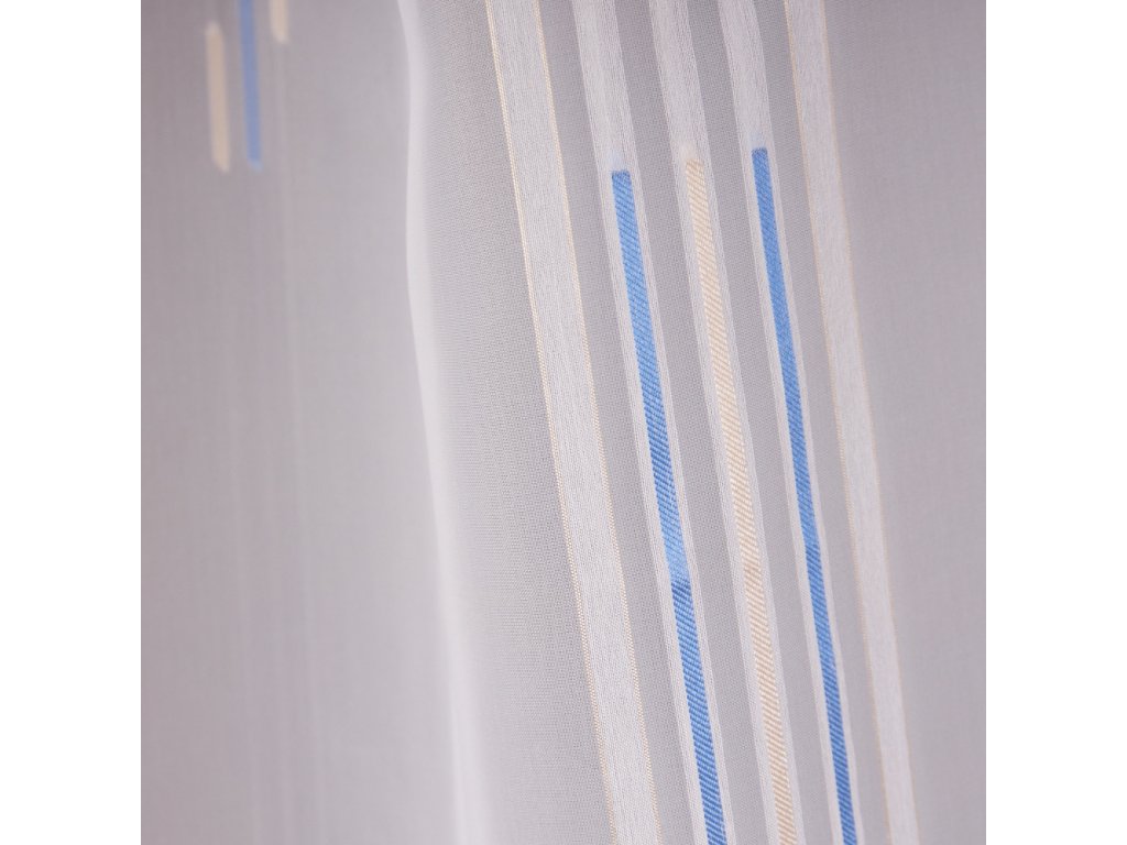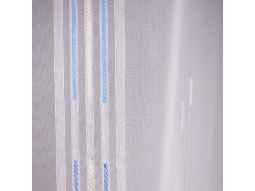 Voálová látka s motivem modrých a zlatých proužků na bílém podkladu, pro ozdobení vašich oken.