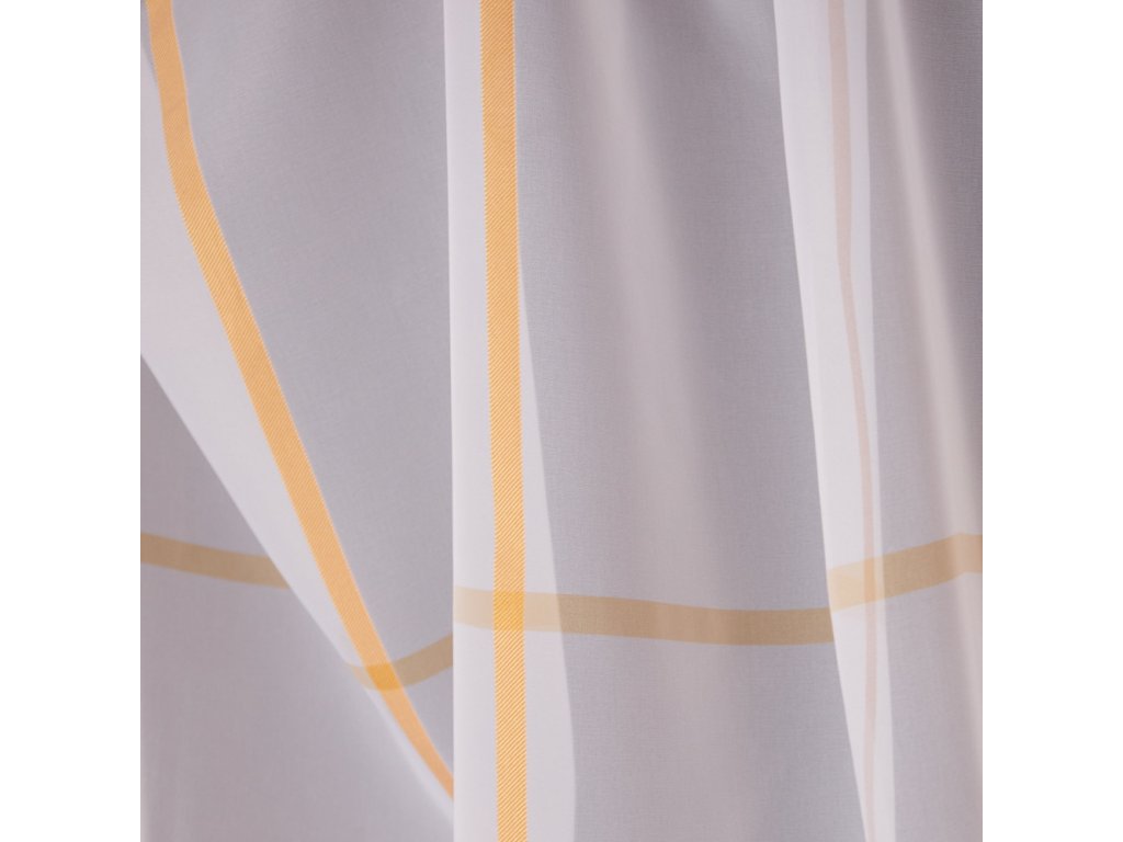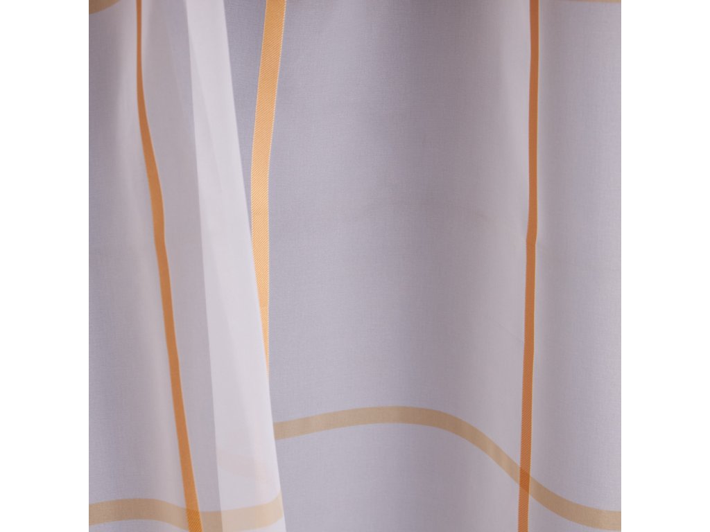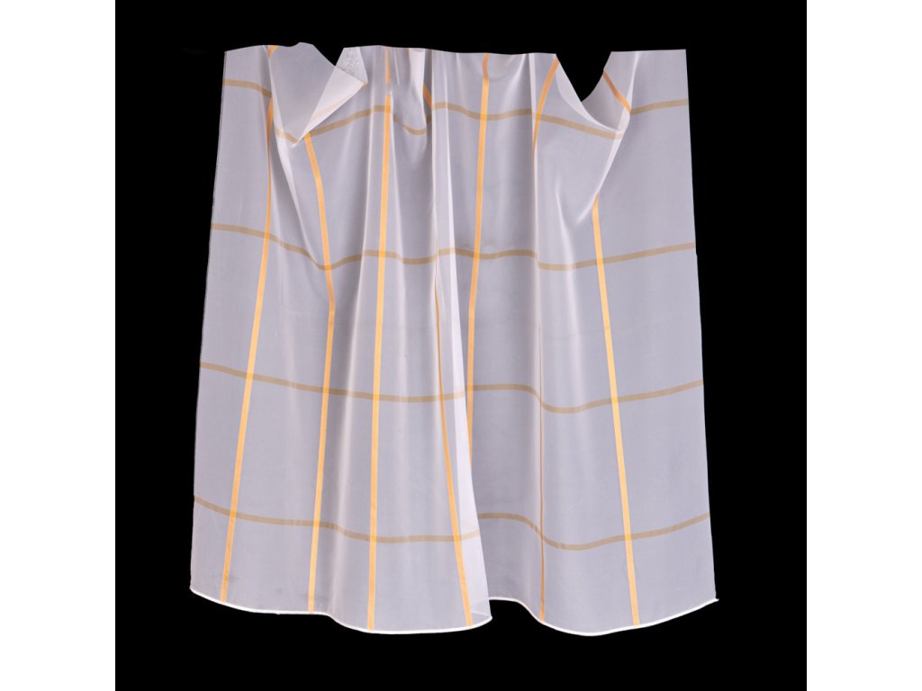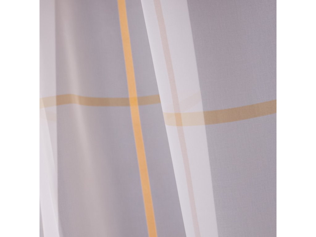 Voálová látka s motivem oranžových čtverců na šedém podkladu, pro ozdobení vašich oken.